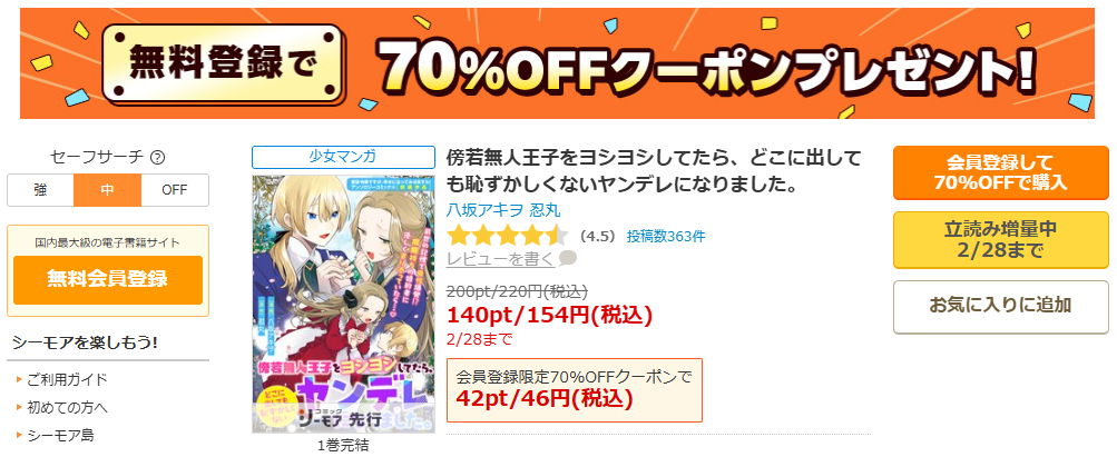 そもそも、シーモアなら2/28までの期間限定で154円、しかも70%OFFクーポンを使えばたったの46円で読めますよ