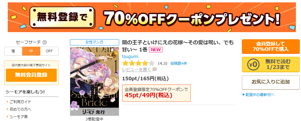 この作品はコミックシーモアで独占・先行の導線が強く、探し回るストレスが少ないのがメリットです。作品ページで、巻数、無料範囲、キャンペーン表記がまとまって見えるのも助かります。