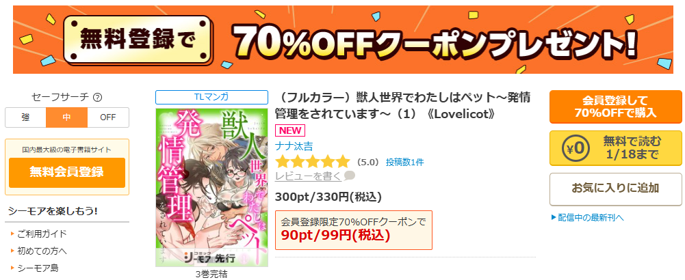 コミックシーモアを推す理由はシンプルで、作品ページで「話売り(分冊)」「単行本」みたいな配信形態が整理されて表示されやすいからです。さらに、購入履歴や続きの管理もしやすいので、どこまで読んだか迷子になりにくいのがありがたいポイントです。
