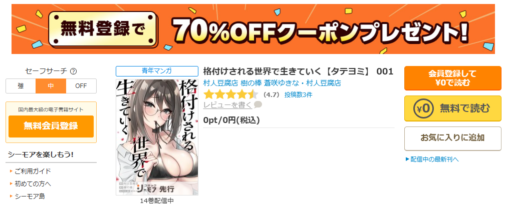 私が確認したタイミングでは、コミックシーモアで1話・2話が登録で0円の導線が出ていました。ここだけでも試せるのはかなり大きいです。しかも序盤って世界観の説明が濃いので、無料範囲だけでも「この作品、自分に合いそうか」が分かりやすいんですよね。特にこの作品は“格付け”という評価軸が絡むので、序盤の空気感で刺さるかどうかが決まりやすいと思います。