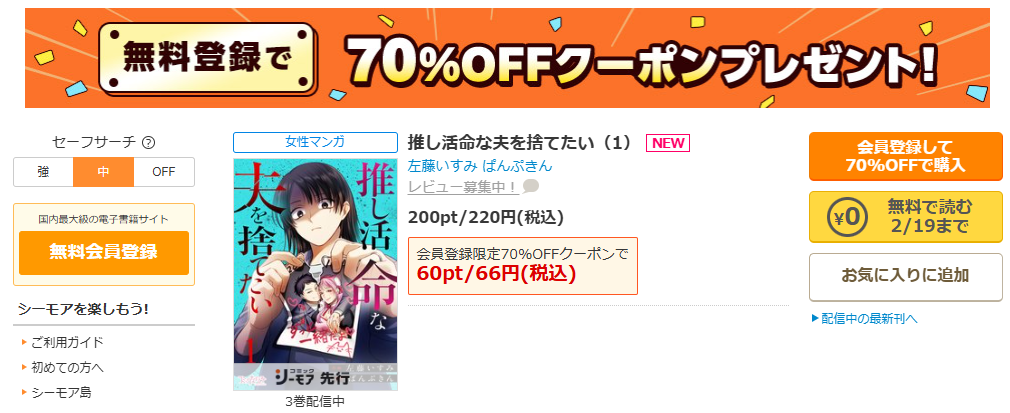 推し活命な夫を捨てたいを読むなら、私はコミックシーモア推しです。理由はシンプルで、作品ページで「配信巻数」「無料表示」「価格」「試し読み」がまとまっていて、情報のブレが少ないから。作品って、読み始めるまでのハードルが低いほど続きやすいんですよね。特に今回みたいに「ネタバレ見たけど、実際に読んだ方が早そう」って作品は、導線の良さが正義です。