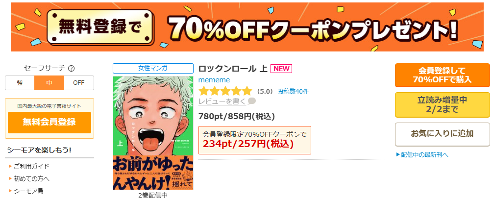ロックンロールを読むなら、私はコミックシーモアを起点にするのがいちばん失敗しにくいと思ってます。理由はシンプルで、作品ページで配信形態や巻の並びが見やすく、購入後の本棚管理も含めて「今どこまで読んだ?」が迷子になりにくいからです。上下巻って“買い間違い”が地味に起きるんですよ。上巻を買ったつもりが分冊だった、とか、下巻を先に買いそうになった、とか。そういう事故を減らすには、購入導線が整理されているのが正義です。