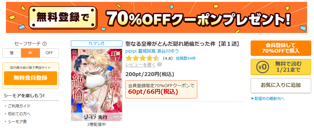 私がコミックシーモアを推すのは、作品ページの情報が比較的まとまっていて、購入判断に必要な材料が揃いやすいからです。試し読みのボリュームは作品ごとに違うこともありますが、少なくとも「絵柄」「テンポ」「会話のノリ」を確認するには十分なケースが多いです。