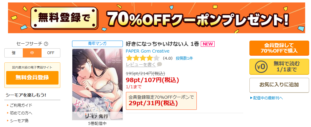 好きになっちゃいけない人を安全に読むなら、私はコミックシーモアを推します。理由は単純で、配信情報がまとまっていて、試し読み・巻数・最新刊が追いやすいから。検索でrawを追いかけるより、最初から公式ストアの作品ページに寄せたほうが、情報のブレが少ないんですよね。