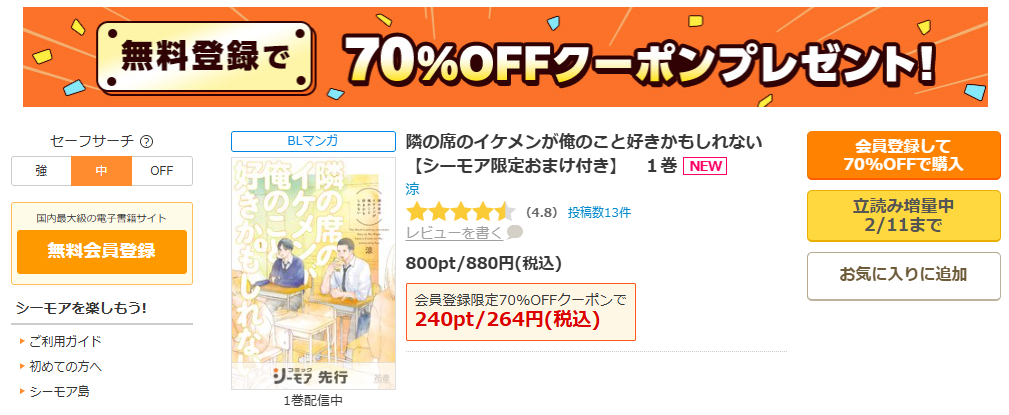 コミックシーモアで無料会員登録をすると、現在、初回購入70%OFFクーポンがもらえます。