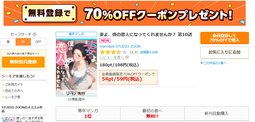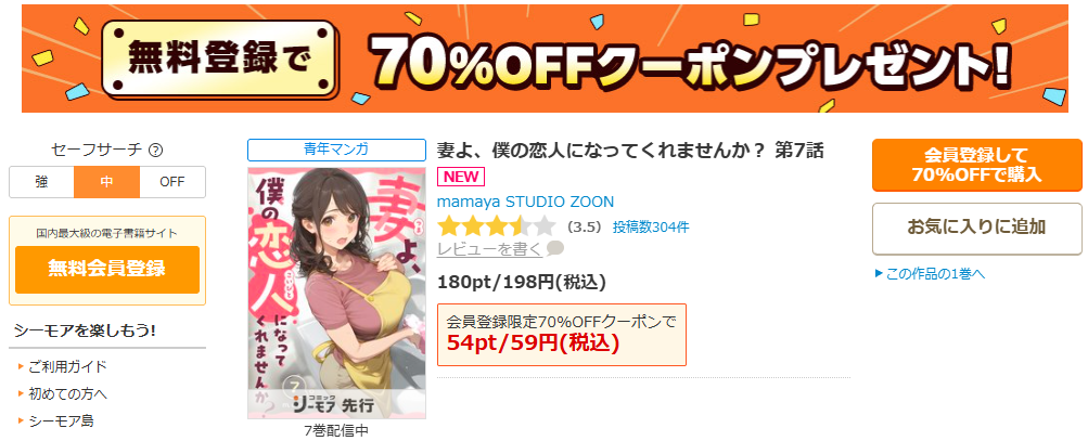 コミックシーモアで無料会員登録をすると、現在、初回購入70%OFFクーポンがもらえます。