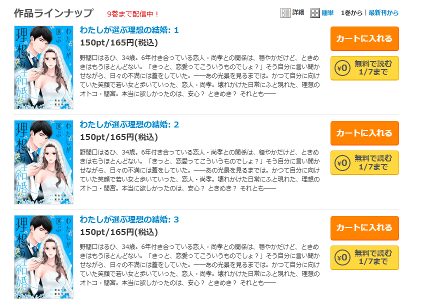 2025年12月時点で、9巻はコミックシーモアで最新巻として配信されています。9話は3巻の冒頭エピソードにあたりますが、電子書籍の巻数としては「わたしが選ぶ理想の結婚:9」という形で区切られているので、「9話=9巻ではない」点だけ少しややこしいかもしれません。「あれ、3巻って何話まで入ってるの?」と戸惑った人もいるはずです。