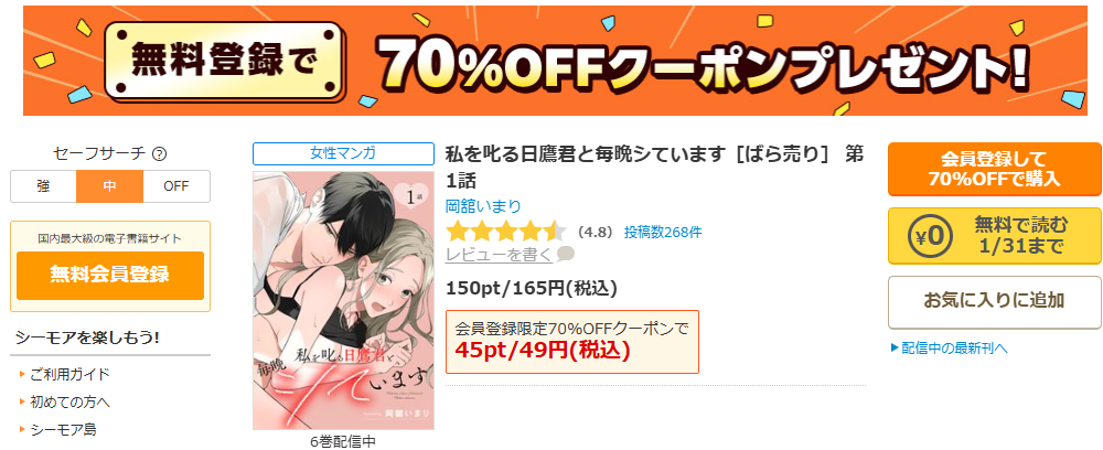 シーモアなら、2話まで無料で読めます。3話以降は70%OFFクーポンでお得に読めますよ