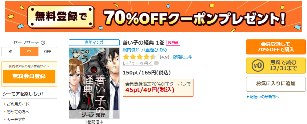 善い子の経典は、公式ページ上で複数巻が並んでいます(巻数の追加やキャンペーン状況は変動します)。ここは断定せずに言うと、最新話ネタバレを追うなら、まず配信サイトの一覧を入口にするのがいちばん早いです。